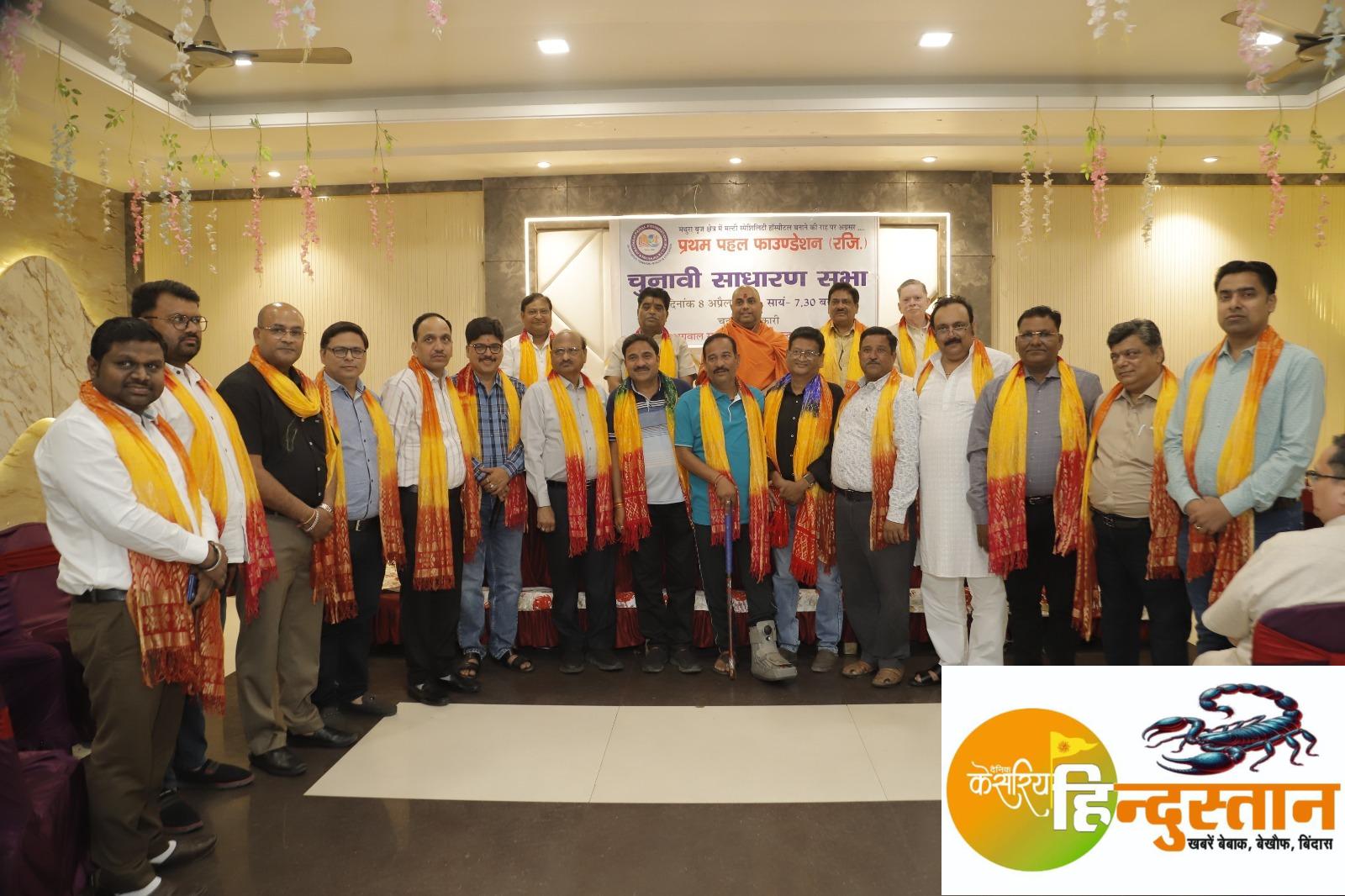 मथुरा। प्रथम पहल फाउंडेशन (रजि.), मथुरा द्वारा चुनावी साधारण सभा का आयोजन स्थानीय होटल में किया गया। कार्यक्रम का शुभारंभ संरक्षक महामंडलेश्वर योगी नवलगिरि महाराज सहित महेश चंद अग्रवाल कसेरे, राम प्रकाश बिंदल, संस्थापक सीए अमित अग्रवाल, चुनाव अधिकारी योगेश सर्राफ, गजानंद अग्रवाल (साड़ी वाले), संजय मित्तल, सुनील अग्रवाल, नवल किशोर अग्रवाल, त्रिलोकी नाथ अग्रवाल, गणेश चतुर्वेदी, गोपाल बंसल, अनुपम शर्मा, मुरारी लाल अग्रवाल, योगेंद्र गोयल, नीरज शर्मा, हरीश अग्रवाल सर्राफ एवं अशोक भारद्वाज सहित अन्य गणमान्य व्यक्तियों द्वारा दीप प्रज्वलन के साथ किया गया।
