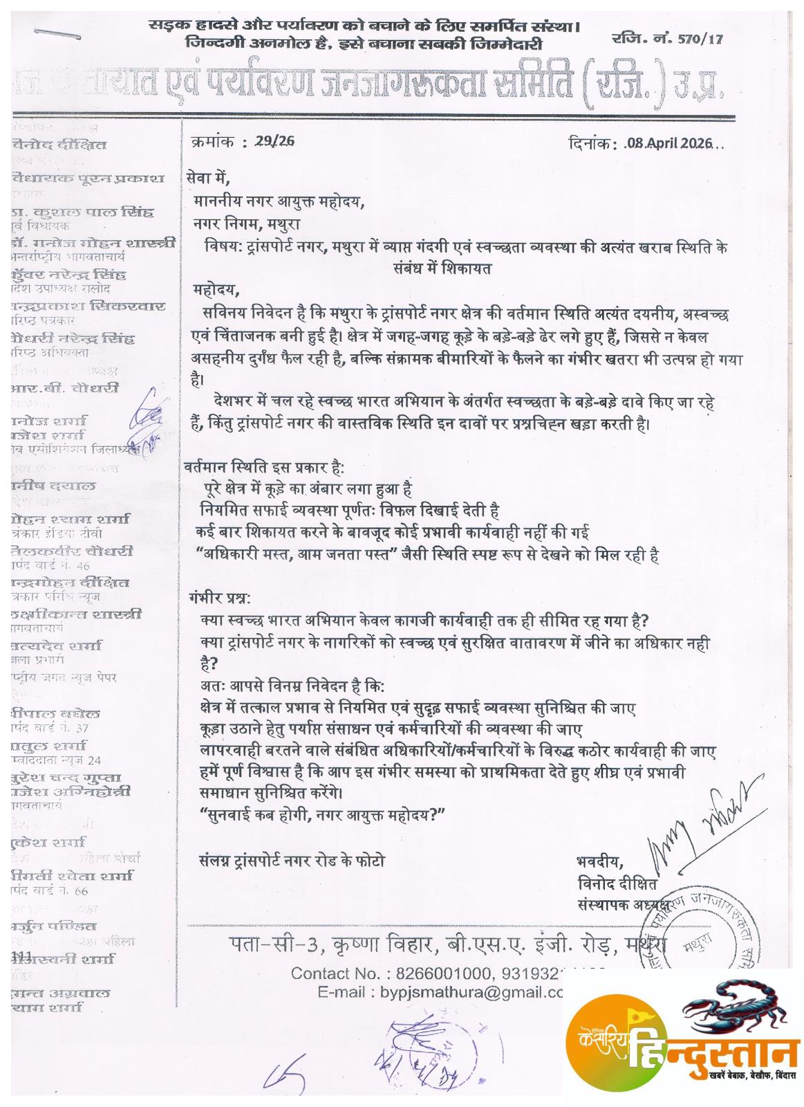 सविनय निवेदन है कि मथुरा के ट्रांसपोर्ट नगर क्षेत्र की वर्तमान स्थिति अत्यंत दयनीय, अस्वच्छ एवं चिंताजनक बनी हुई है। क्षेत्र में जगह-जगह कूड़े के बड़े-बड़े ढेर लगे हुए हैं, जिससे न केवल असहनीय दुर्गंध फैल रही है, बल्कि संक्रामक बीमारियों के फैलने का गंभीर खतरा भी उत्पन्न हो गया है।